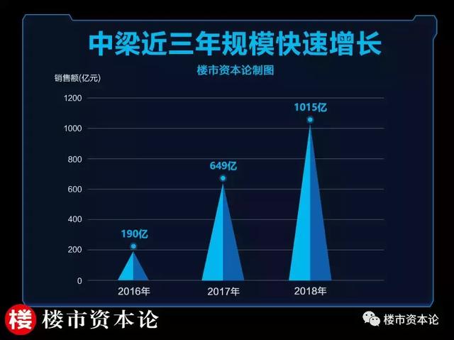 招股书显示,中梁控股2016年、2017年及2018年全年的销售额分别为190亿、649亿、1015亿。这三年里,从百亿裂变到千亿,中梁的发展速度远超行业水准,年复合增长率超过70%;而龙头房企平均增速仅30%。